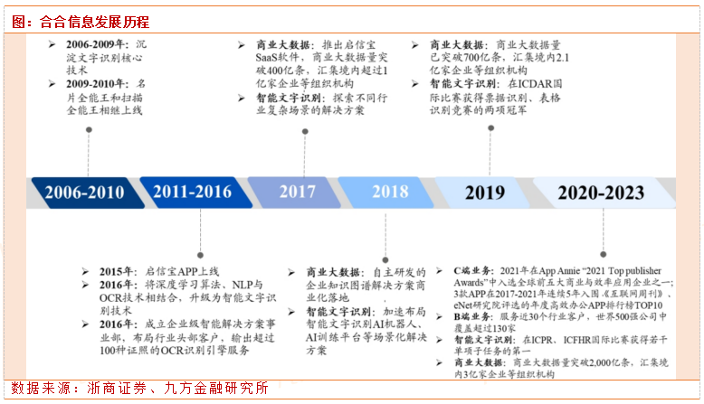 合合信息成立于2006年,成立伊始就将文字识别技术作为核心技术方向,并在2009-2010年打造名片全能王和全能扫描王这两款核心 C 端 APP。2015 年,公司利用自身技术优势快速切入商业大数据领域,以把握大数据领域的发展机遇。2016 年,公司将深度学习算法、自然语言处理技术与 OCR 技术相结合,自主研发智能文字识别技术,大幅度提升智能文字识别技术的性能和应用场景,并将 AI 技术落地成为产品级应用。