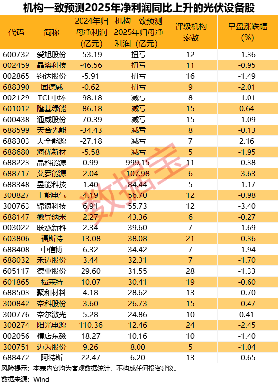 从盈利预测来看,5家及以上机构评级的光伏设备股共有32只,其中29股机构一致预测2025年净利润有望同比上升,爱旭股份、晶澳科技、钧达股份、固德威机构预测实现扭亏为盈,TCL中环、隆基绿能、通威股份等6股预计实现减亏。