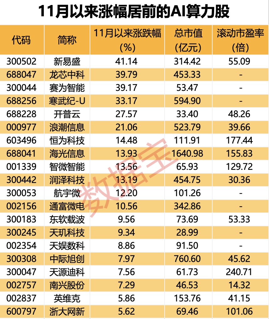 证券时报·数据宝统计显示,A股中,布局AI算力的概念股共有53只,本月以来普遍上涨,12股涨幅在10%以上,新易盛、龙芯中科、赛为智能、寒武纪-U涨幅居前,均在30%以上。