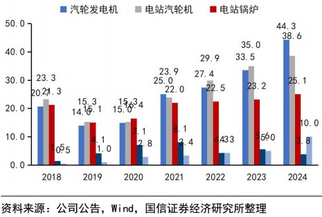 2024年公司发电设备产量58.1GW,其中汽轮发电机44.3GW,同比增长32%,风力发电机组10GW,同比增长100%。2025年一季度公司发电设备产量17.9GW,同比增长75.6%。其中:汽轮发电机13.9GW,同比增长55%;风力发电机组3.31GW,同比增长253%。