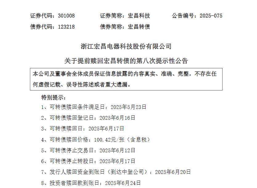 除华翔转债外,宏昌转债也即将在本月迎来最后交易日。6月4日晚间,宏昌科技发布关于提前赎回“宏昌转债”的第八次提示性公告,提醒投资者6月12日宏昌转债将停止交易。6月12日至13日、6月16日,宏昌转债持有人只能进行转股。6月16日收市后,转债持有人仍未转股,公司将以100.42元/张的价格强制赎回宏昌转债。