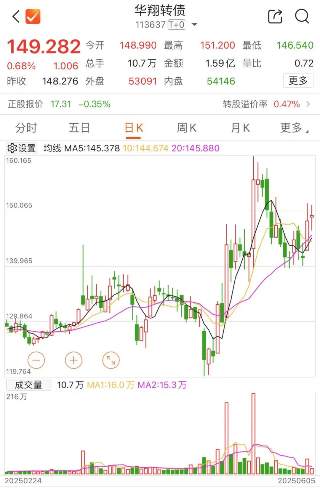 截至6月5日收盘,华翔转债价格为149.282元/张。对照100.7068元/张的强赎价格,投资者若是未及时操作,或将亏损超32%,截至目前,华翔转债仍有0.47亿元余额尚未完成交易或转股,所占比例近6%。