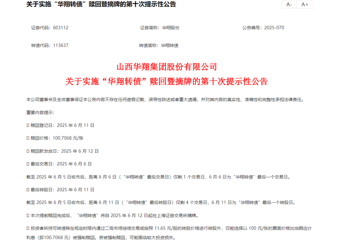 6月5日晚间,华翔股份发布关于实施“华翔转债”赎回暨摘牌的第十次提示性公告,提醒投资者6月6日为华翔转债最后一个交易日,6月11日是最后一个转股日,债券持有人应及时卖出或转股。6月11日收市后,未实施转股的华翔转债将全部冻结,停止交易和转股。