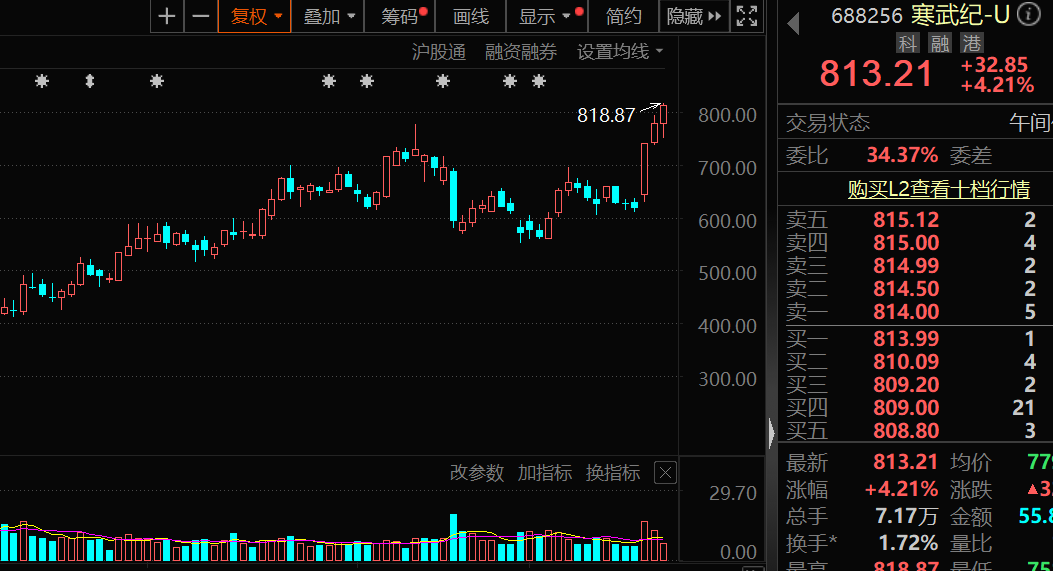2月25日早盘,寒武纪-U上涨4.21%,股价首次突破800元,达到813.21元/股,股价再创历史新高,最新A股市值接近3400亿元。该公司为AI芯片龙头,在人工智能(AI)浪潮的带动下,成为A股科技领域的明星股。据统计,截至2月24日收盘,该股近三年内区间最大涨幅已到达16.08倍。