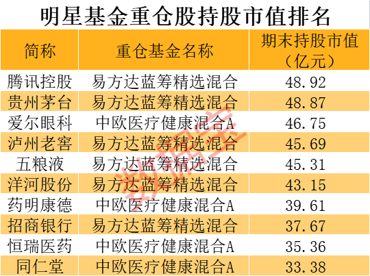 张坤执掌的易方达蓝筹精选重仓腾讯控股期末持股市值最高,达到48.92亿元;紧随其后的依然是易方达蓝筹精选重仓贵州茅台,期末持股市值达48.87亿元;排名第三的是葛兰旗下的中欧医疗健康,重仓爱尔眼科,持股市值达46.75亿元;排名第四至第六的均为张坤的易方达蓝筹精选,重仓泸州老窖、五粮液、洋河股份等,期末持股市值均超40亿元。