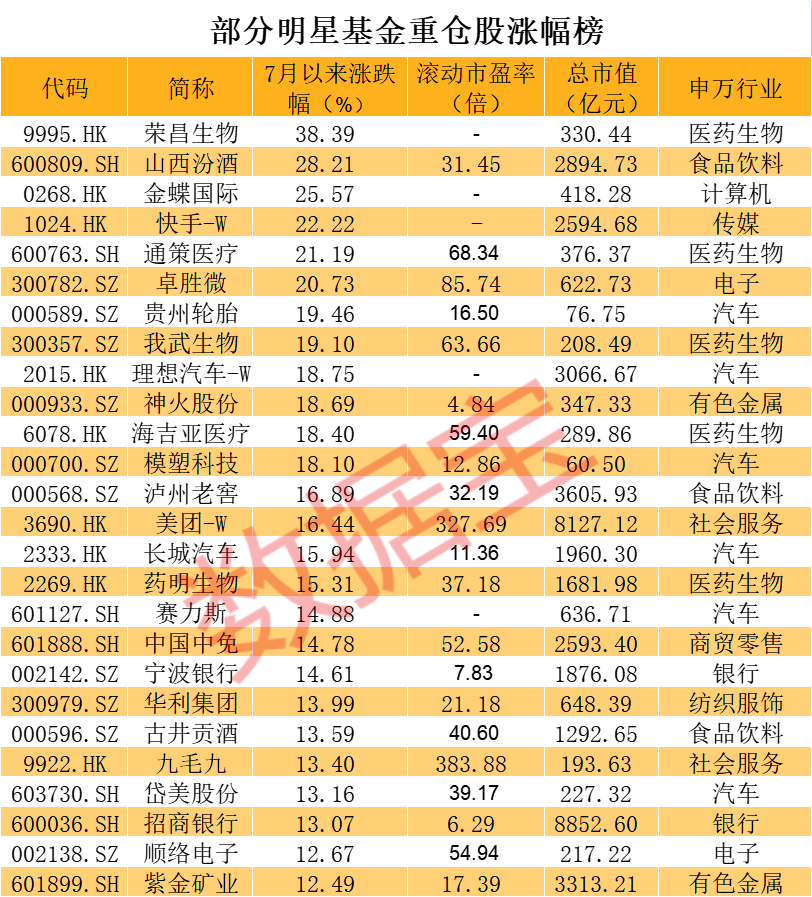 7月以来沪深两市走势剧烈分化,上证指数大涨2.31%,深证成指、创业板指两大指数均小幅上扬,科创50指数跌超4%。港股市场走势更为强劲,恒生指数7月以来大涨超5%。部分明星基金配置的港股走势亮眼,荣昌生物大涨超38%,金蝶国际、快手-W等个股均涨超20%。A股方面,山西汾酒、通策医疗、卓胜微等个股均大涨超20%。