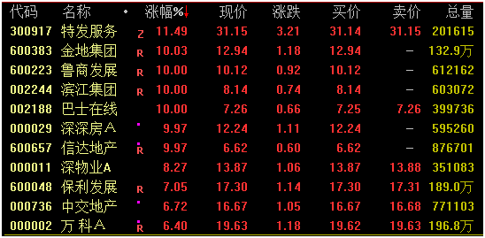 A股方面,地产板块今日逆势拉升,截至收盘,特发服务涨逾11%,金地集团、鲁商发展、滨江集团、信达地产、深深房A等涨停,深物业A涨逾8%,保利发展涨逾7%;万科A涨6.4%,当前市值约2220亿元。