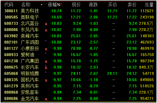 汽车、光伏板块今日大幅下挫,长安汽车、小康股份、广东鸿图、金刚玻璃、振邦智能、松芝股份等多只热门股跌停。其中,长安汽车盘中再创新高后快速跳水,午后跌停;7连板振邦智能上演“天地板”走势。