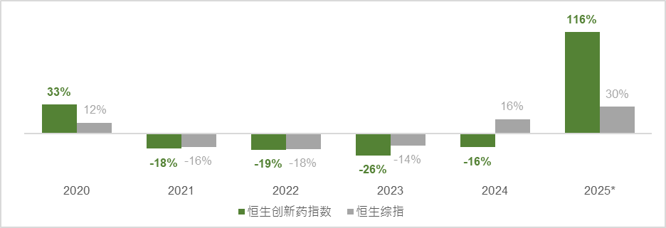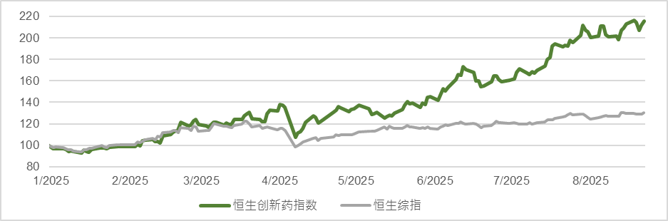 恒指公司于博客中表示,经过连续4年下跌后,恒生创新药指数今年有望实现自2020年以来的首个上升年度。年初截至2025年8月22日,恒生创新药指数上升116%,跑赢大市(以恒生综指为代表)30.5%的升幅,以及整体医疗保健业91.2%的升幅。值得留意的是,年内的强劲表现,令指数上升至2021年12月以来的最高水平12月以来的最高水平。