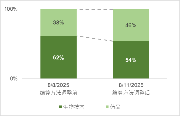 按最新的编算方法调整后,7只来自生物技术业务子类别的成份股被剔除,令恒生创新药指数的构成有所转变。截至2025年8月11日,生物技术及药品分别占指数权重约54%及46%(图4),调整前为62%及38%。