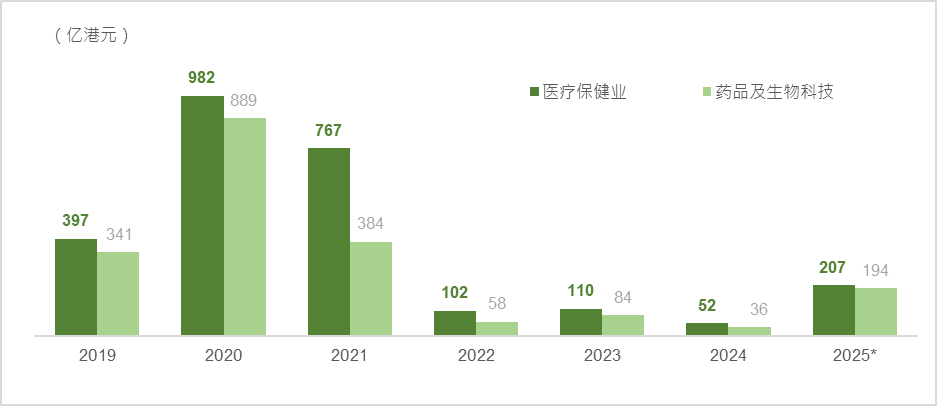 值得一提的是,港股IPO市场今年回暖,当中医疗保健业IPO的活跃程度明显回升。自2021年开始,医疗保健业IPO所募集的资金持续下跌,至2024年跌至仅高于50亿港元(图3)。但过去数年的下行趋势在2025年开始逆转。截至2025年8月22日,医疗保健相关的IPO年内已募集207亿港元资金,不但较2024年全年集资额高出299%,亦是2021年以来的最高水平。医疗保健业IPO回暖,主要是由药品及生物科技带动,年初至今集资额达194亿港元,占医疗保健业IPO约93%。
