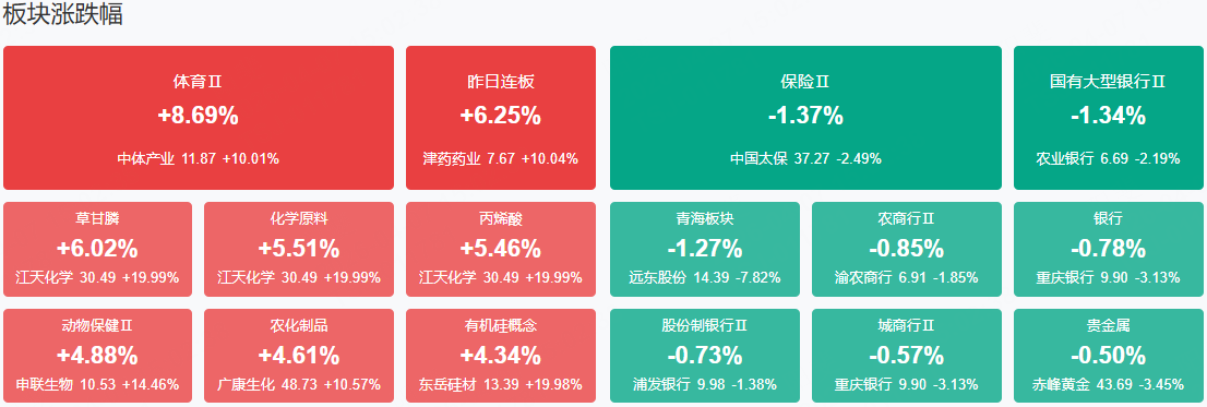 板块方面,体育、化工、PCB等板块表现活跃,保险、银行、贵金属等板块表现落后。截至收盘,沪指涨0.26%,深成指涨0.36%,创业板指涨0.36%。