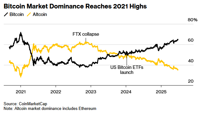与此形成鲜明对比的是,山寨币正在衰落。一个追踪市值前100名数字资产中后半部分的MarketVector指数,在特朗普于2024年11月5日赢得大选后曾上涨了一倍多,但随后全数回吐涨幅,2025年至今已下跌约50%。