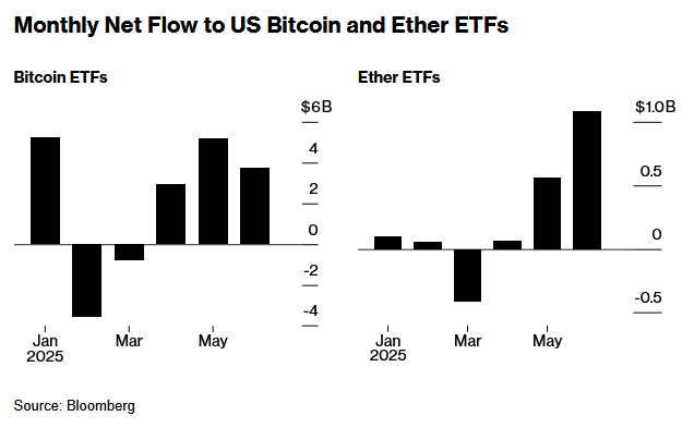 机构行为的变化也体现出趋势转变。继Michael Saylor的Strategy(MSTR.US)持续增持比特币后,一批新的比特币积累者相继出现。4月,与Cantor Fitzgerald LP关联的一家特殊目的收购公司与Tether Holdings SA和软银合作,成立了Twenty One Capital Inc.,启动资金为近40亿美元的比特币。特朗普家族也涉足比特币,并通过特朗普媒体科技集团(DJT.US)筹集了23亿美元,用于建立比特币储备。虽然近期也出现了用于积累像以太坊、Solana和币安币这类山寨币的类似投资载体,但其规模要小得多。