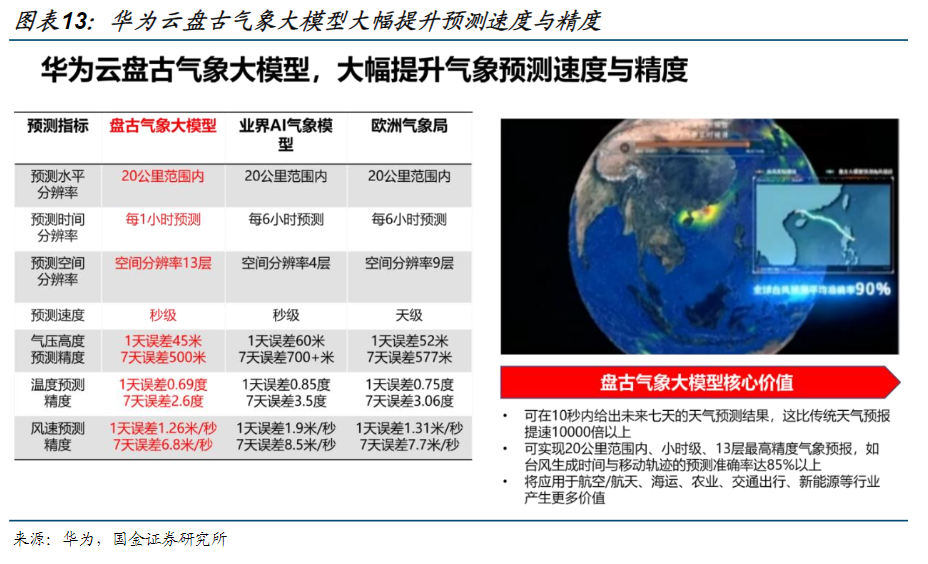 值得一提的是,华为云盘古气象大模型已于4月上线,是全球首个精度超过传统预报方式的AI模型,可实现20公里范围内、小时级、13层最高精度气象预报,如台风生成时间与移动硅基的预测准确率达85%以上。