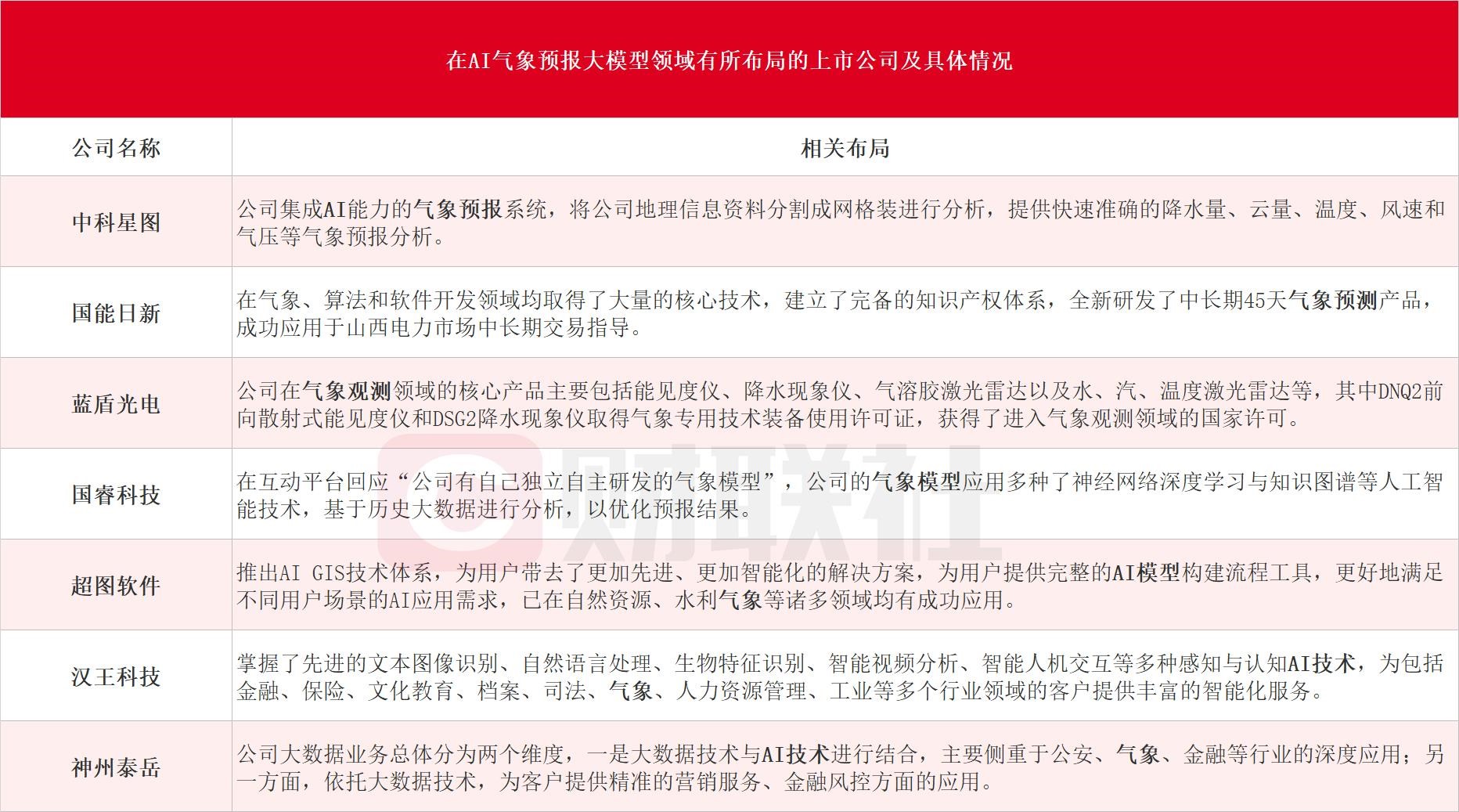 据财联社不完全统计,在AI气象预报大模型领域有所布局的A股上市公司包括中科星图、国能日新、蓝盾光电、国睿科技、超图软件、汉王科技和神州泰岳等,具体情况如下: