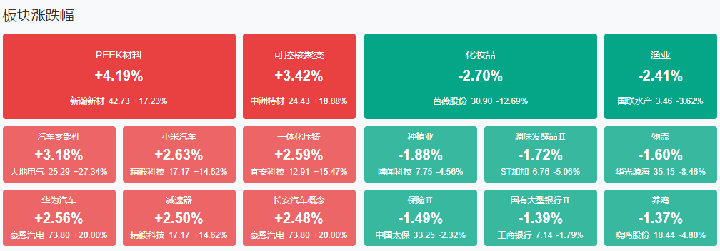 板块方面,PEEK材料、可控核聚变、机器人、成飞概念等板块涨幅居前,美容护理、保险、物流、农业等板块跌幅居前。截至收盘,沪指跌0.52%,深成指涨0.08%,创业板指涨0.16%。