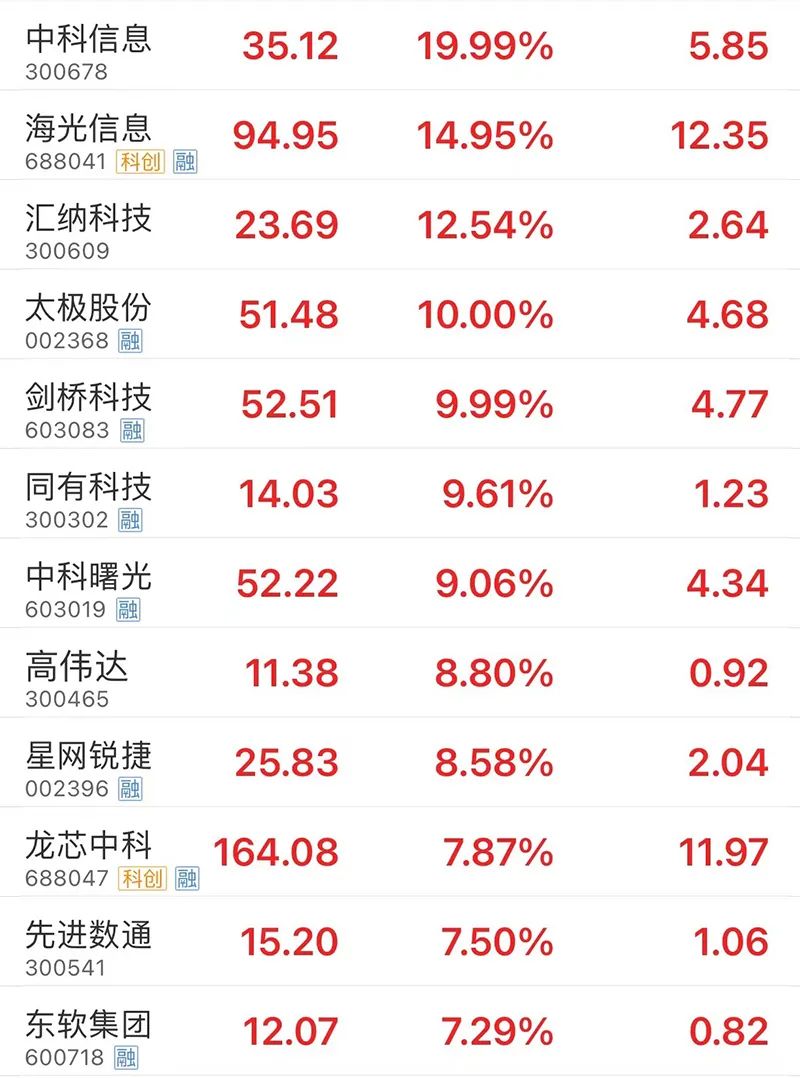 今日,受人工智能相关产业链全面回暖提振,信创板块也迎来爆发。截至午间收盘,中科信息以20%涨停,海光信息、汇纳科技涨超10%,太极股份涨停股价再创新高。