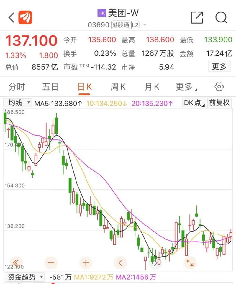 自股权激励计划发布以来,美团-W累计涨幅约5%。今日早盘,美团-W盘中涨1.33%。