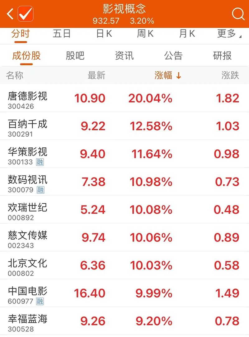 今日,传媒板块盘中强势拉升,影视股表现活跃。截至午间收盘,唐德影视以20%涨停,百纳千成、华策影视、数码视讯等涨超10%,欢瑞世纪、慈文传媒、北京文化、中国电影等多股涨停。