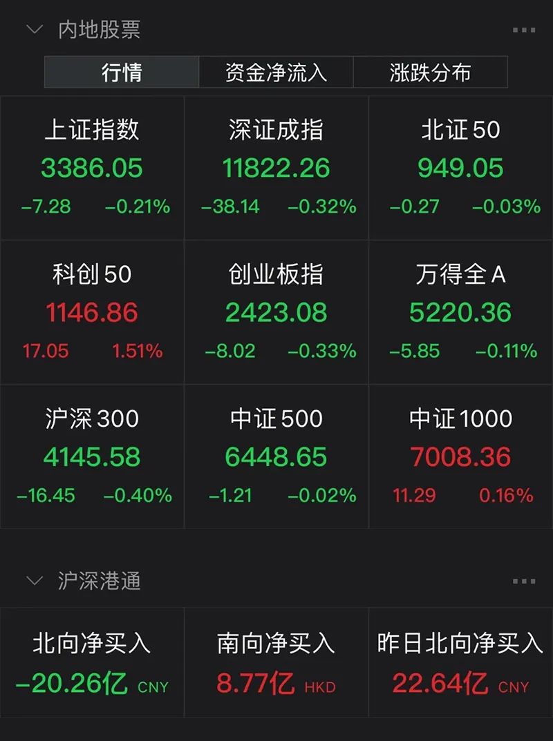 周三,三大指数震荡调整。截至午间收盘,上证指数跌0.21%,深证成指跌0.32%,创业板指跌0.33%。北向资金半日净流出20.26亿元。