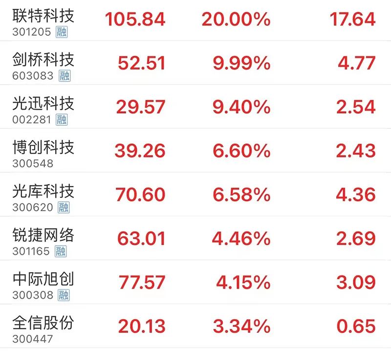 CPO概念今日持续火热。截至午间收盘,联特科技以20%涨停,剑桥科技2连板,光迅科技涨超9%,博创科技、光库科技等涨幅居前。