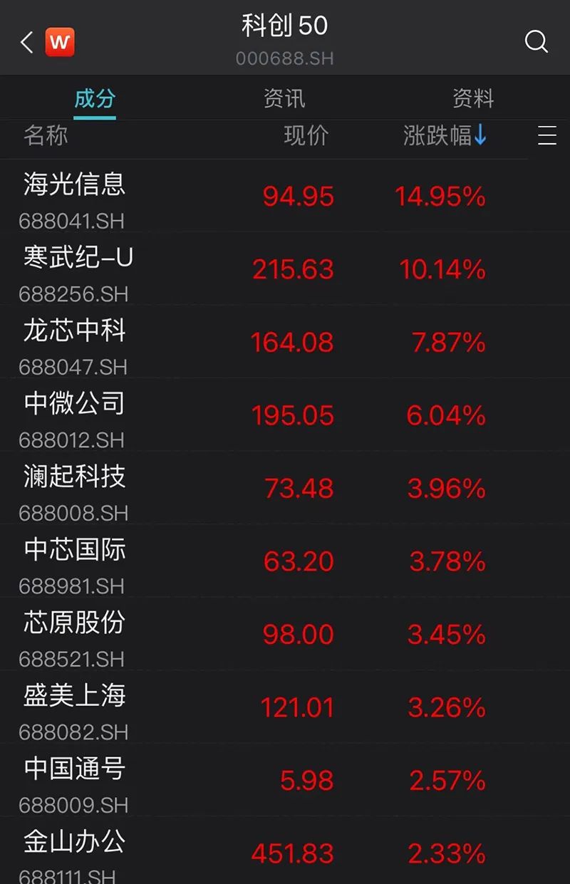 今日,三大指数早盘震荡整理,均小幅下跌,科创50逆势上涨1.51%,AI+方向全面开花。截至中午收盘,海光信息涨近15%,寒武纪涨超10%,龙芯中科、中微公司等涨幅居前。