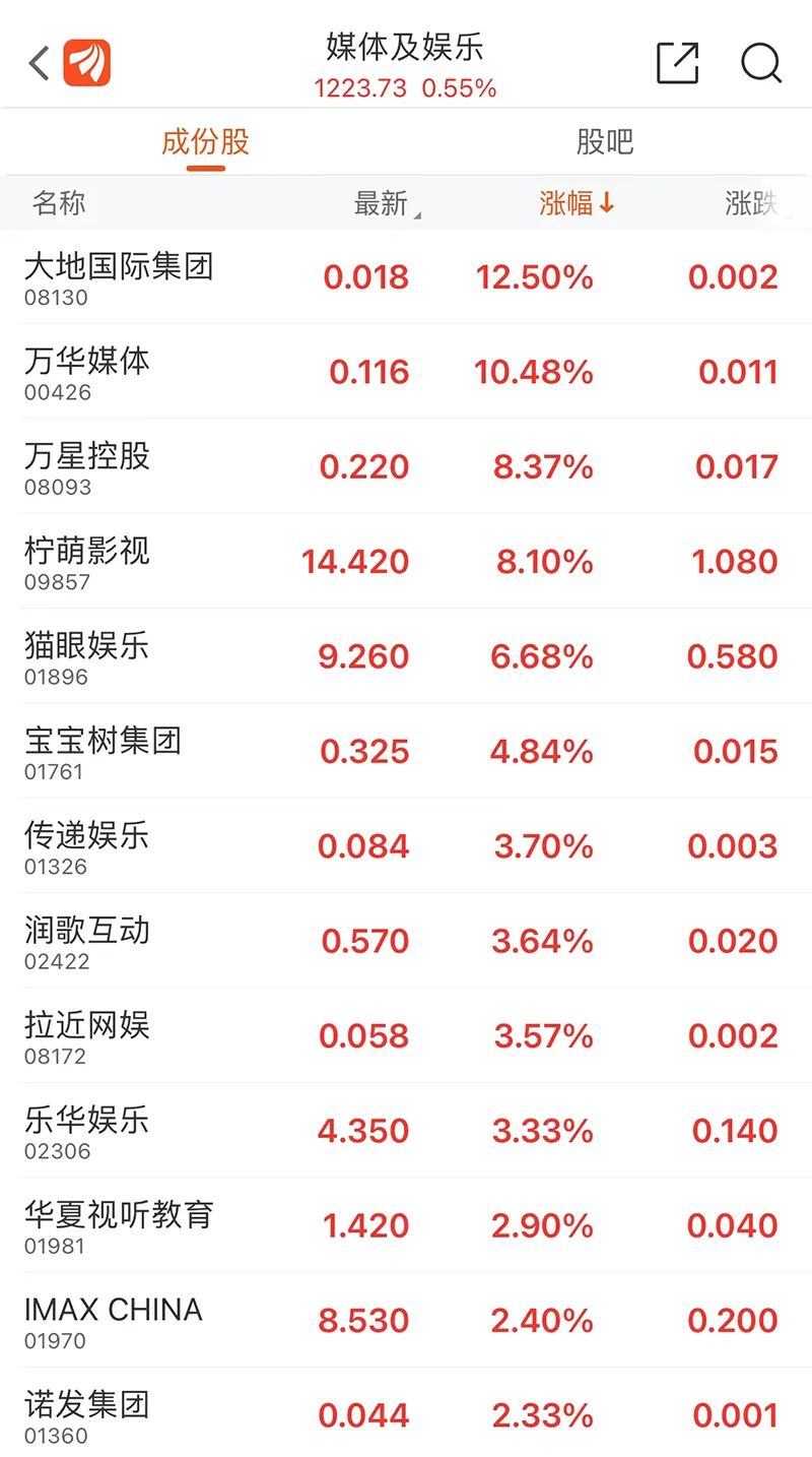 随着五一假期临近,今日早盘,港股媒体娱乐股集体走强。截至发稿,柠萌影视涨逾8%,猫眼娱乐涨逾6%,宝宝树集团涨逾4%,润歌互动涨近4%,乐华娱乐涨超3%。