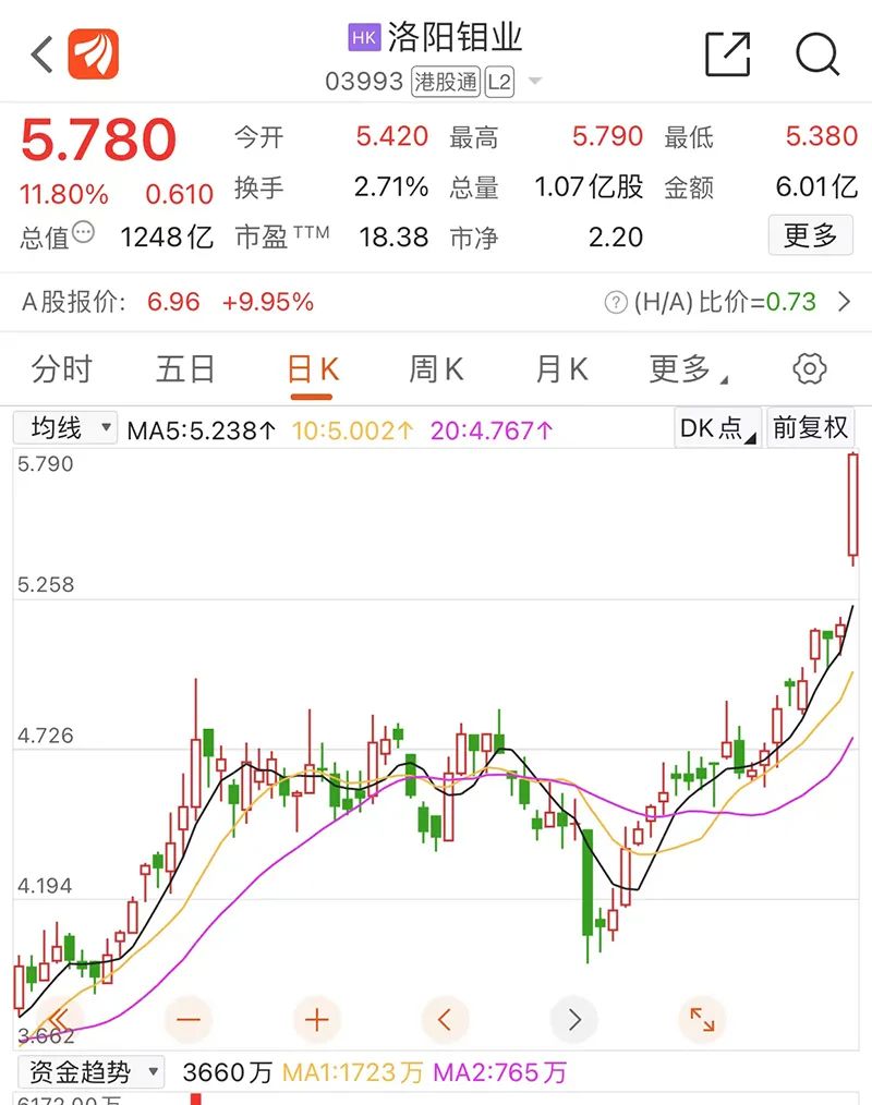 自去年10月底以来,洛阳钼业涨幅已超过120%,并于今日盘中达到5.78港元/股,股价创下近两年新高。