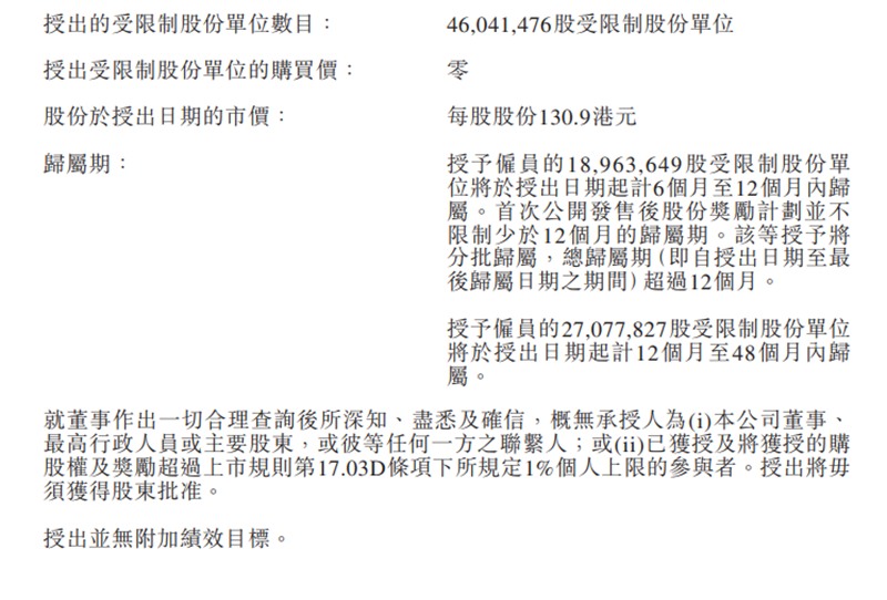 美团对此次的股权激励设置了归属期,分别有6个月至12月以及12个月至48个月不等。美团方面表示,此次的股权激励行为是为了使承授人的利益与集团利益一致,并鼓励及留住承授人,为集团的长远发展及利润增长作出贡献。