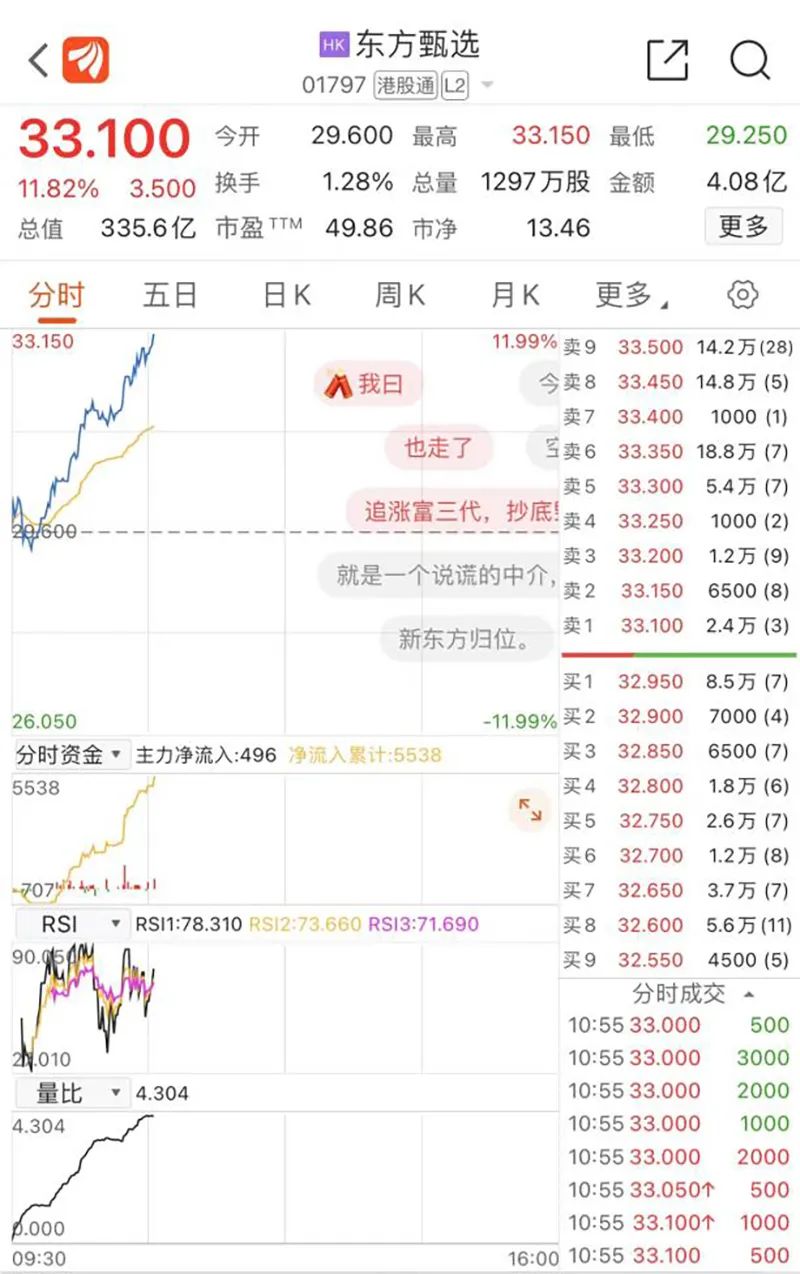 今日早盘,东方甄选盘中涨近12%,现报33.1港元/股,成交额4.08亿港元。
