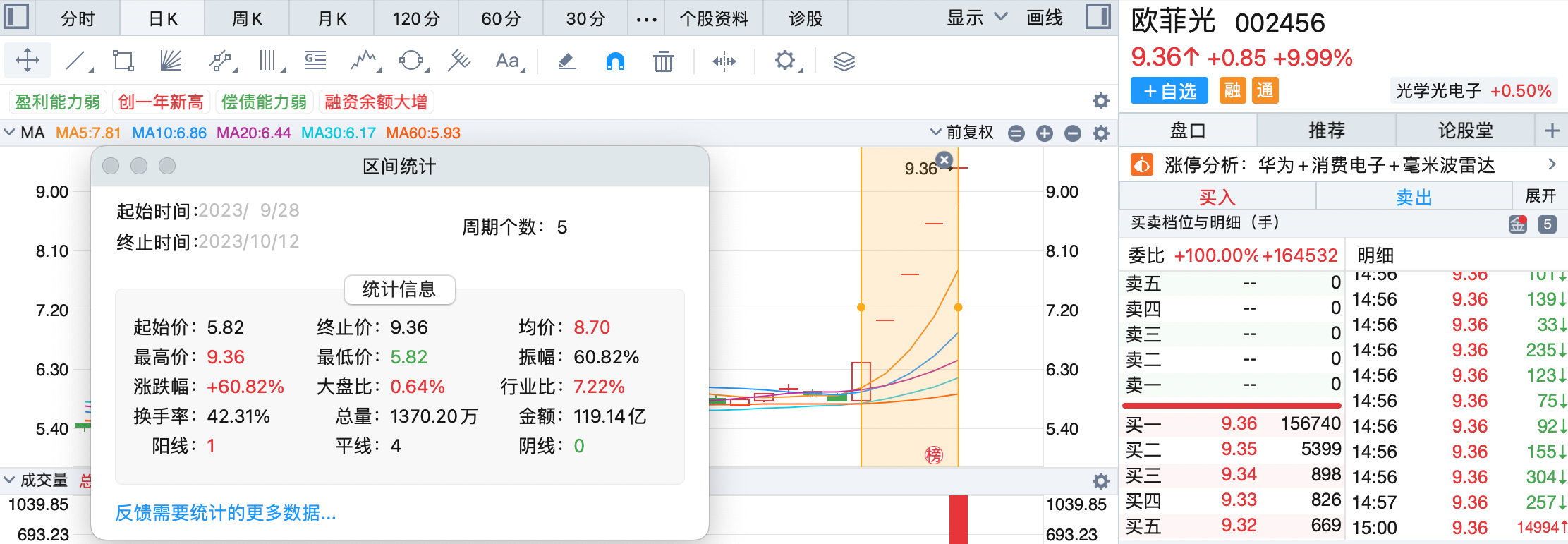 总市值超300亿元的光学赛道龙头欧菲光尾盘回封涨停,收盘斩获5连板,全天成交金额96.18亿元。