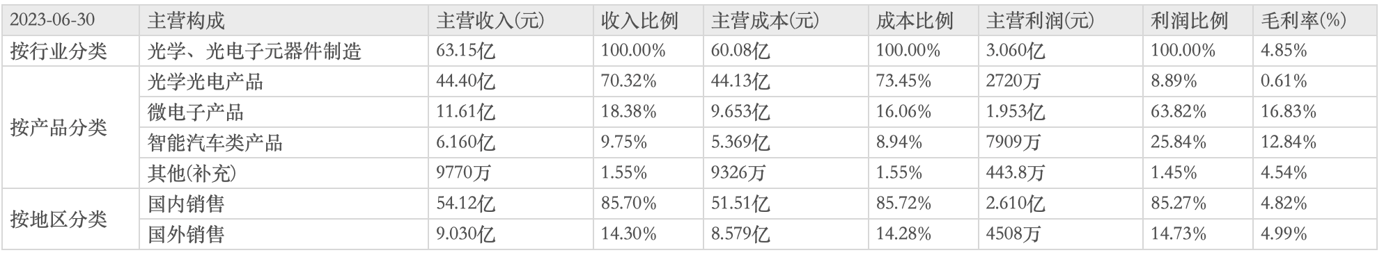 公开信息显示,欧菲光主营业务为智能手机、智能汽车及新领域业务,公司产品包括光学影像模组、光学镜头、微电子及智能汽车相关产品等。截至2023年中,欧菲光光学光电产品的收入44.4亿,占比总营收的70.32%。