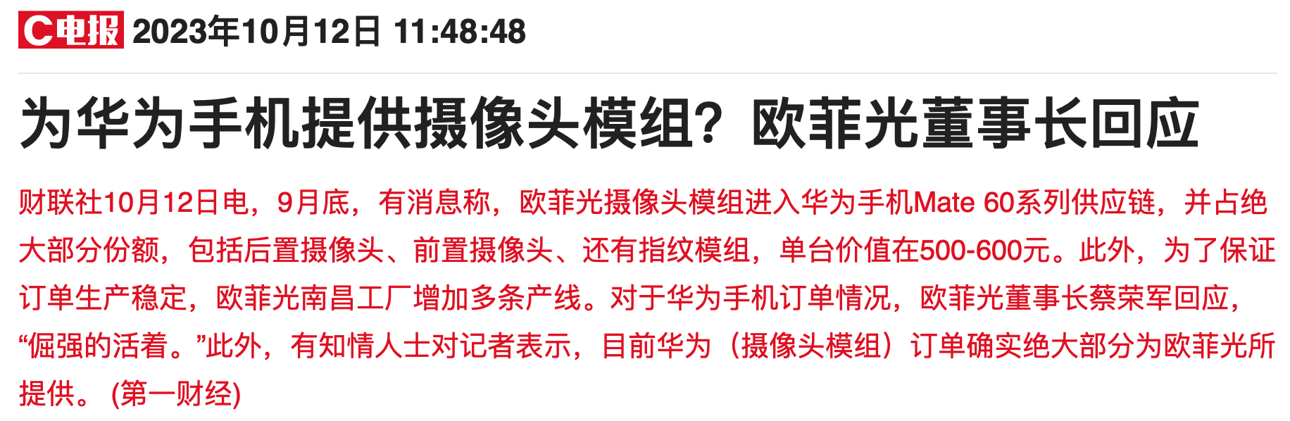 此前有消息称欧菲光摄像头模组进入华为手机Mate 60系列供应链,并占绝大部分份额,为了保证订单生产稳定,欧菲光南昌工厂增加多条产线。据媒体最新报道,欧菲光董事长蔡荣军回应华为手机订单情况:“倔强的活着”。此外,有知情人士表示,目前华为(摄像头模组)订单确实绝大部分为欧菲光所提供。