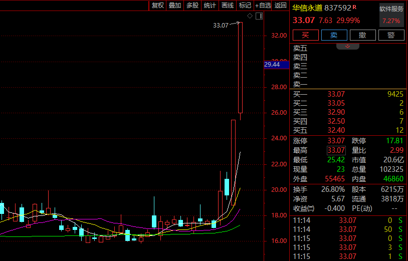 华信永道直线30%涨停,股价创历史新高;银之杰也20%涨停,近7个交易日6涨停,短时间内暴涨220%;天玑科技、英方软件、安硕信息等批量20cm封板,大智慧、恒生电子等超40股涨停或涨超10%。
