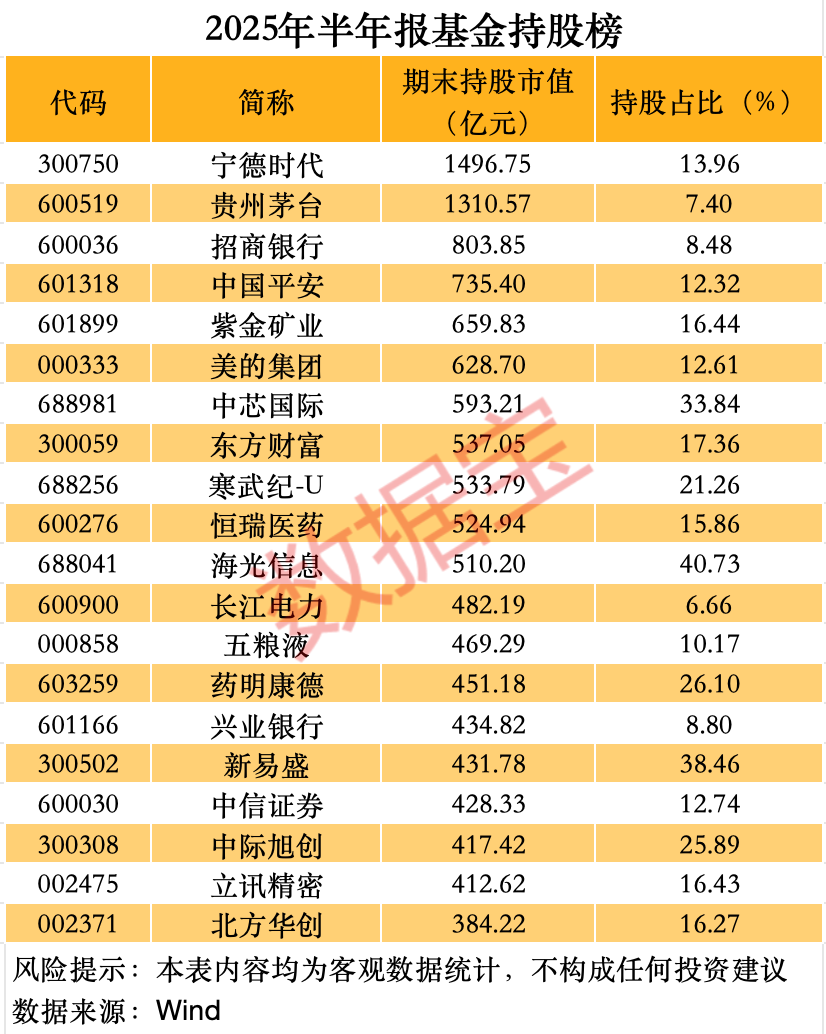 数据宝统计的《2025年半年报基金持股榜》显示,117股获公募基金持股市值逾百亿元。宁德时代、贵州茅台稳坐排行榜的冠亚军席位。