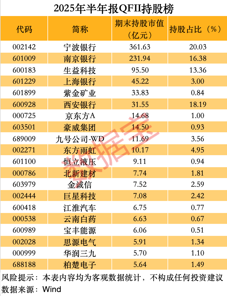 宁波银行、南京银行、生益科技、上海银行、紫金矿业持仓市值排名前五,均在30亿元以上。宁波银行和南京银行继续霸榜,持股市值均超200亿元,分别为361.63亿元和231.94亿元。QFII持股占流通股比例方面,上述50股中,宁波银行、西安银行、南京银行、生益科技排名靠前,分别为20.03%、18.19%、16.38%和13.36%。