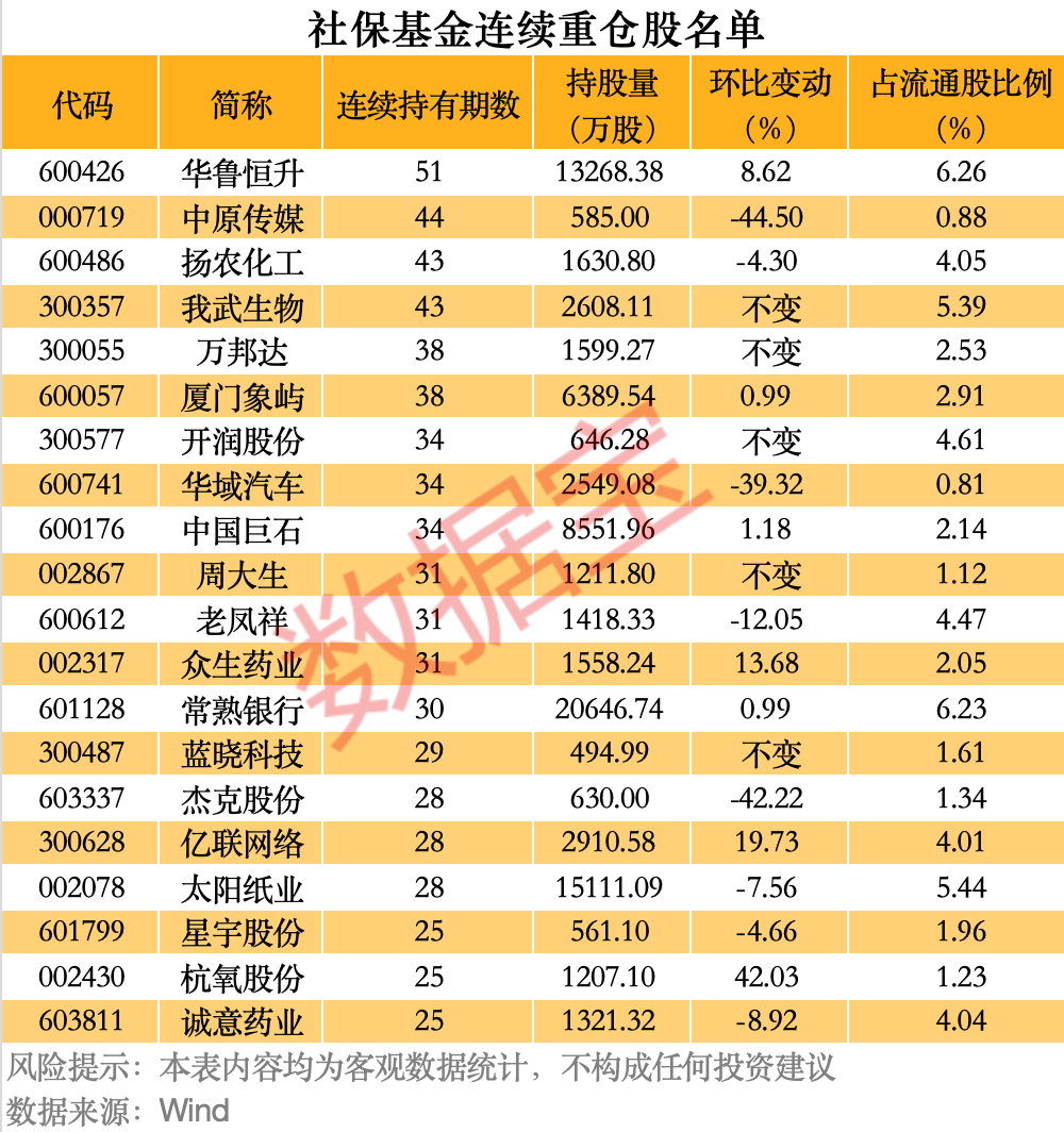 作为风格稳健的长期机构投资者,社保基金长线持有的重仓股更引人关注,据数据宝统计,共有258只股获社保基金连续持有4个季度以上。其中,160只社保基金持有期超过两年,华鲁恒升、中原传媒等46只获社保基金连续持仓超5年。