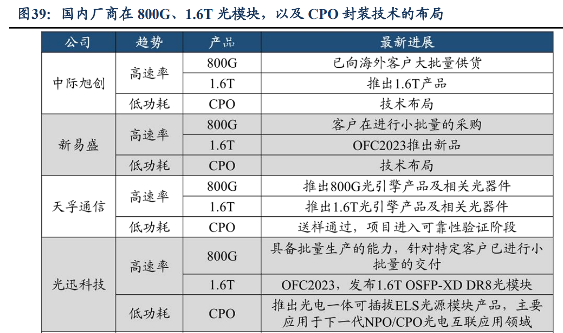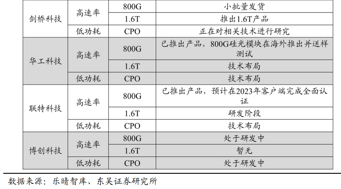 在1.6T光模块具体布局方面,据东吴证券分析师周尔双等7月2日发布的研报梳理,中际旭创的1.6T光模块已进入送测阶段;天孚通信已推出1.6T光引擎产品及相关光器件;光迅科技、新易盛1.6T光模块都在OFC2023期间发布,目前正在积极推进客户送样测试工作,剑桥科技、联特科技和华工科技的1.6T光模块还在研发阶段。