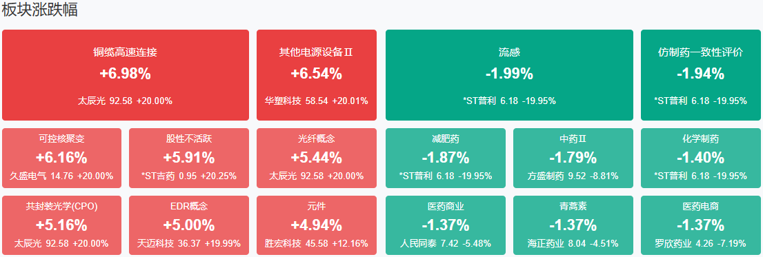 板块方面,铜缆高速连接、数据中心电源、CPO、半导体等板块涨幅居前,流感、中药、医药商业、创新药等板块跌幅居前。