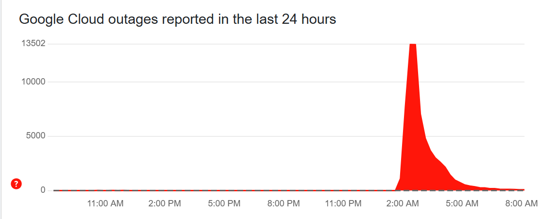 Downdetector网站显示,截至美东时间下午3点,已经有超过1.3万名用户报告谷歌云出现故障。