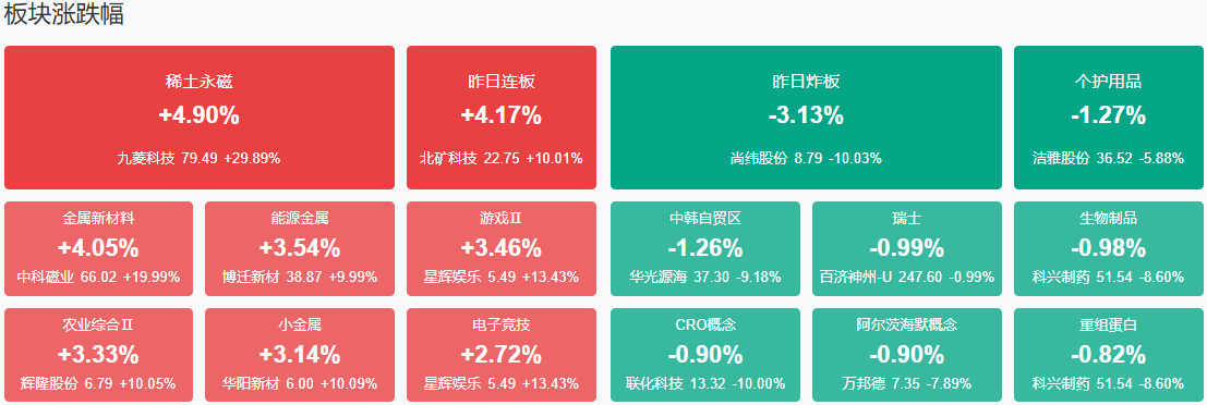 板块方面,稀土永磁、游戏、汽车零部件、证券等板块涨幅居前,可控核聚变、生物疫苗、通信服务等板块跌幅居前。截至收盘,沪指涨0.52%,深成指涨0.83%,创业板指涨1.21%。