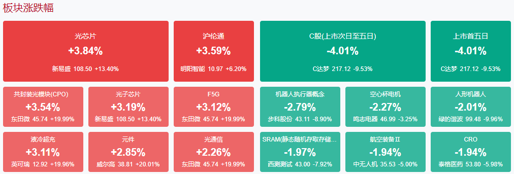 盘面上,CPO概念股集体走强,新易盛、中际旭创均再创历史新高,剑桥科技涨停。PCB概念股反复活跃,沪电股份、胜宏科技创历史新高,威尔高、晨丰科技涨停。大金融股午后拉升,香溢融通涨停,海通证券一度涨停。地产股盘中异动,冠城大通涨停,中交地产一度涨停。电网概念股表现活跃,中辰股份、奥特迅、长城电工、北京科锐等涨停。下跌方面,CRO概念股展开调整,泰格医药跌超5%。板块方面,CPO、证券、房地产、特高压等板块涨幅居前,科创板次新、CRO、人形机器人、军工等板块跌幅居前。