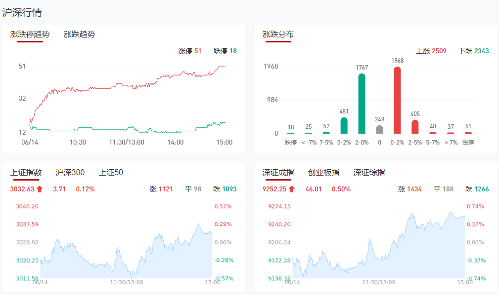 市场全天震荡反弹,三大指数均小幅上涨。截至收盘,沪指涨0.12%,深成指涨0.5%,创业板指涨0.76%。总体上个股涨多跌少,全市场超2600只个股上涨。沪深两市今日成交额8481亿,较上个交易日放量956亿。