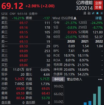4月10日,亿纬锂能高开,截至发稿,该股涨近3%,报69.12元。