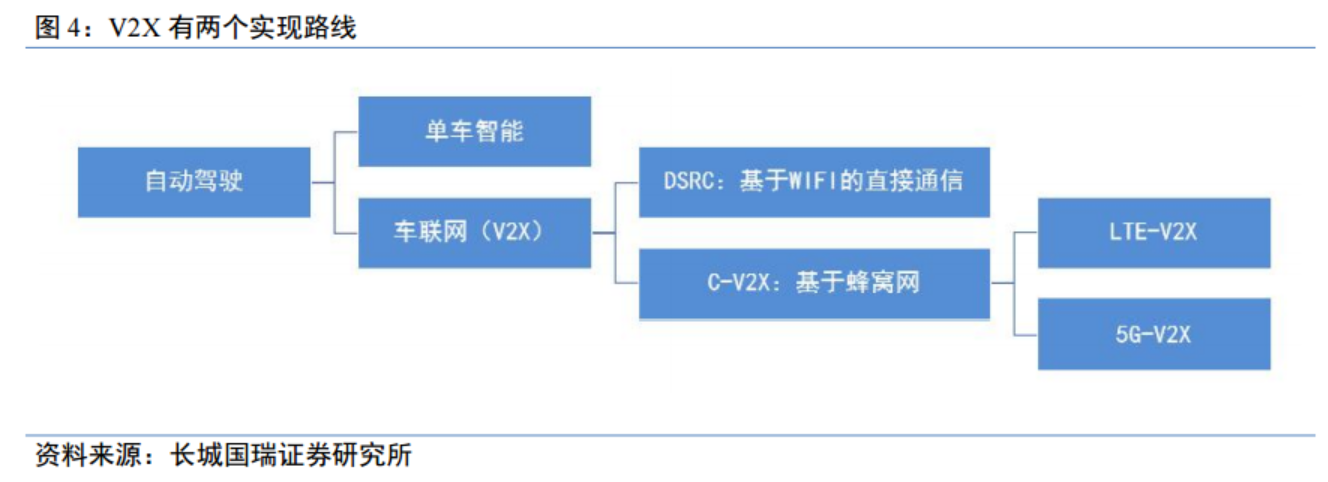 V2X的实现路线有两个,DSRC与C-V2X。蜂窝车联网(Cellular-V2X)由3GPP提出,由中国主导,主要有LTE-V2X和5GNR-V2X两种。2020年11月美国联邦通讯委员会将5.9GHz频段划拨给C-V2X使用,2020年4月,工信部批准了7个V2X标准,C-V2X逐渐成为车联网的主流。