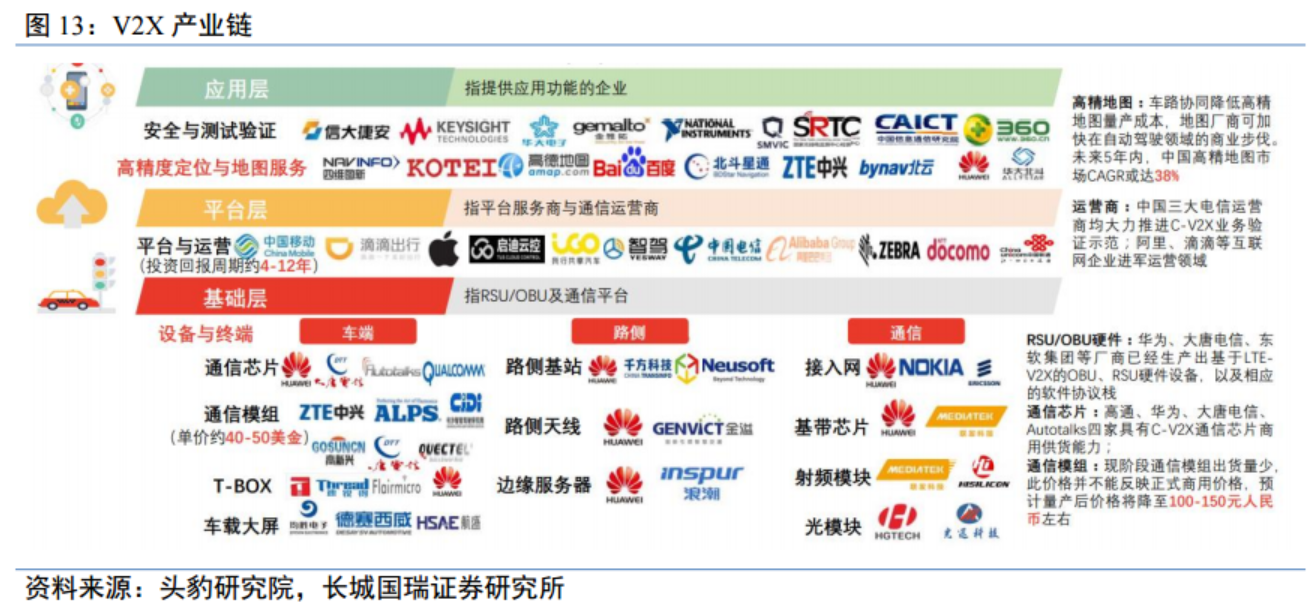 长城国瑞证券马晨2022年12月27日研报中表示,在产业协同层面,我国已经形成了包括芯片模组、终端设备、整车应用、安全、高精度定位及地图服务等环节的完整产业链生态。产业链上游的芯片模组,大唐电信、华为、高通、移远通信、芯讯通等企业已对外提供基于C-V2X的芯片模组。在软硬件设备方面,华为、大唐电信、金溢科技、星云互联、东软集团、万集科技等厂商已经可以提供基于LTE-V2X的OBU、RSU硬件设备,以及相应的软件协议栈。