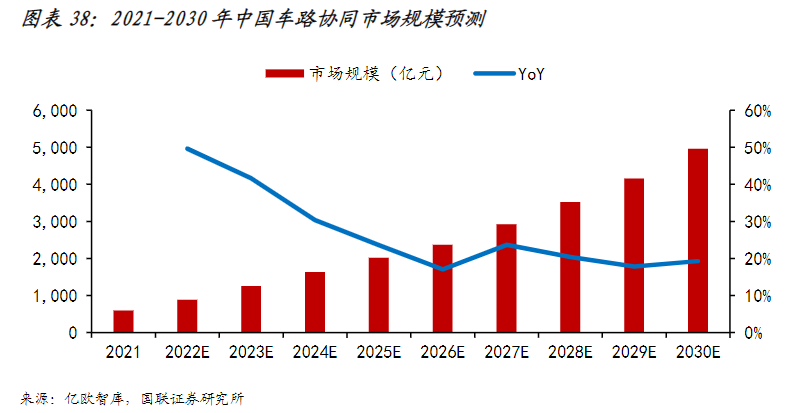 根据国际市场研究公司Technavio的数据,全球车路协同市场规模预计将在2025年达到约1700亿美元,年复合增长率(CAGR)为34.6%。国联证券孙树明1月17日研报中表示,2020年新基建政策出台后,车路协同便与智慧城市绑定,成为智慧交通的必备要素,2022年开始更多城市及区域级试点项目逐步落地。据亿欧智库预测,随着车路协同逐步走向规模化与市场化,2030年中国车路协同市场规模有望达到4960亿元,市场潜力广阔。