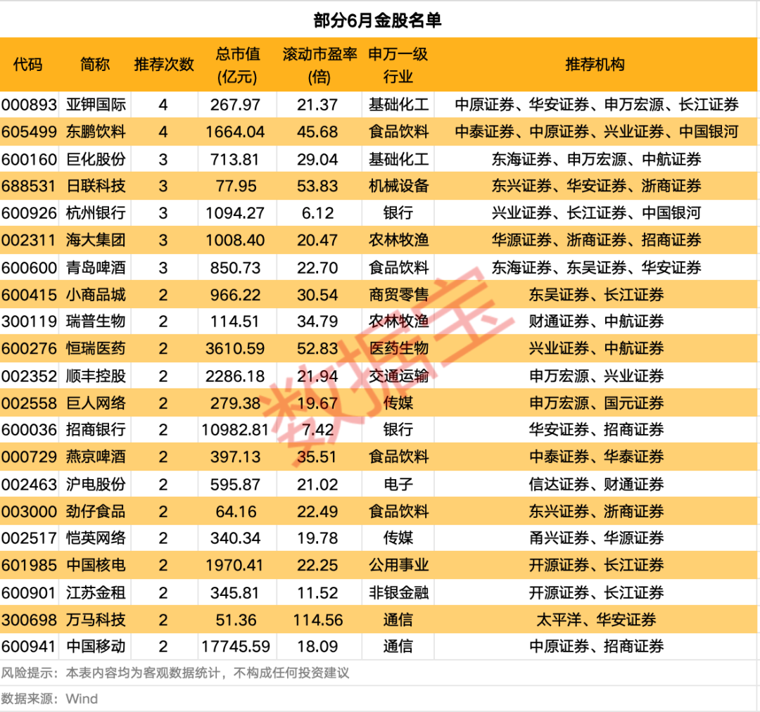 按券商推荐次数统计,截至6月2日,共计21股获得2家及以上券商推荐。其中,亚钾国际(000893)与东鹏饮料(605499)并列第一,均获得4家券商机构推荐;巨化股份、日联科技、杭州银行、海大集团、青岛啤酒等股随后,均被3家券商共同看好。