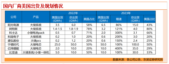 从储能系统来看,阳光电源、阿特斯、科陆电子、比亚迪均以自主品牌出货,其中阿特斯依靠集团旗下EPC部门在美国多年的项目资源积累,美国出货占比高,我们预计阿特斯2022-23年美国出货1.4-1.5/3.2GWh,2023年同增121%,2022-23年分别占总出货约78%/80%。